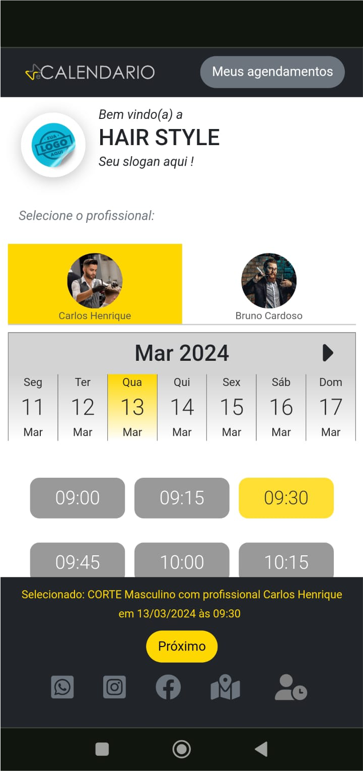 A agenda do profissional atualizada é exibida com todos os horários disponíveis para aquele serviço escolhido.